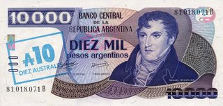 10.95 10 Australes (nedatata; circa 1985; overprint peste 10,000 Pesos)