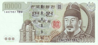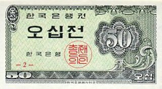 Bancnote pentru vanzare sau schimburi din Coreea de Sud; numerele de culoare albastra denota pretul in lei noi iar numerele rosii reprezinta numarul de ordine in catalogul Pick. Toate bancnotele din aceasta pagina sunt necirculate. Click pe o imagine pentru a o mari.