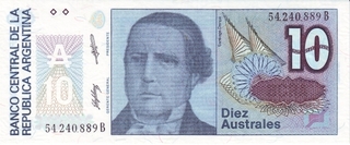 10.95 10 Australes (nedatata; circa 1985; overprint peste 10,000 Pesos)