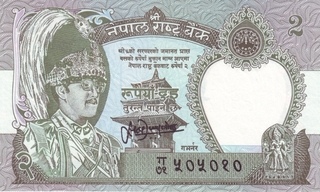 11.70 20 Rupii (nedatata; Gyanendra; text centrat; ornament alb in centru-sus)