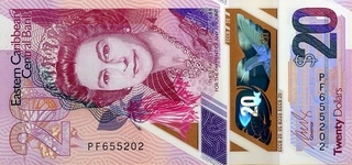 Bancnote pentru vanzare sau schimburi din Statele Est Caraibeene; numerele de culoare albastra denota pretul in lei noi iar numerele rosii reprezinta numarul de ordine in catalogul Pick. Toate bancnotele din aceasta pagina sunt necirculate. Click pe o imagine pentru a o mari.