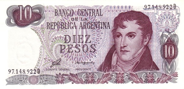 52. *nou* Argentina 295 5.65 NECIRCULATA 10 Pesos (nedatata; circa 1973-1976; Decreto-Ley 18.188)